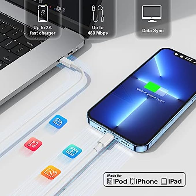 ?【20W Fast Charging&Syncing 】Charging iPhone 13 12 from 0% to 70% in just 30 mins.PD 3.0 Quick-Charge USB C charger with 10ft type c to lightning cable saves more than 1 hour for you when compared to the 5W original charger.It also support the fast data transfer rates up to 480Mbps.Enjoy your faster charging and data transfering.