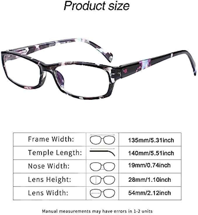 【Anti Glare UV Filter Lens】: Womens Blue light Reading Glasses with the polycarbonate material high-definition lens,Can Reduce Digital Eye Distortion, Block Blue Light, gaming and working under fluorescent lights with protection vision and glare reduction,no worry about eye fatigue, blurred vision.let. 【Fashion Design and Adjustable Spring Hinge 】:our product is made of durable TR90 material, lightweight and Flexible. The comfortable nose pad design will not make you feel uncomfortable to squeeze. A variety of Colorful to choose from, blue light ray reading glasses used in reade books/watching TV/mobile phone/ipad/computer games/work etc. 【Unisex Reading Glasses】:Square frames ,suitable for big, medium or small face.Total Width:(135mm/5.31inch) Temple Length:(130mm/5.12inch) Lens Width:(54mm/2.12inch) Lens Height:(28mm/1.10inch) Bridge Distance:(19mm/0.74inch. 【5 pairs Computer Readers for Women】:5 pack Included in a Set (Comes with a cloth bag and cleaning cloth), you can place a set of glasses where you need to read, which is convenient for daily use or which can be a exquisite gift sending to your families and friends. 【100% NO RISK WARRANTY AFTER SALE】:In order to creating greating shopping experience for our customers.Customers can return the goods for any reason and get a refund. You have no risk of buying.