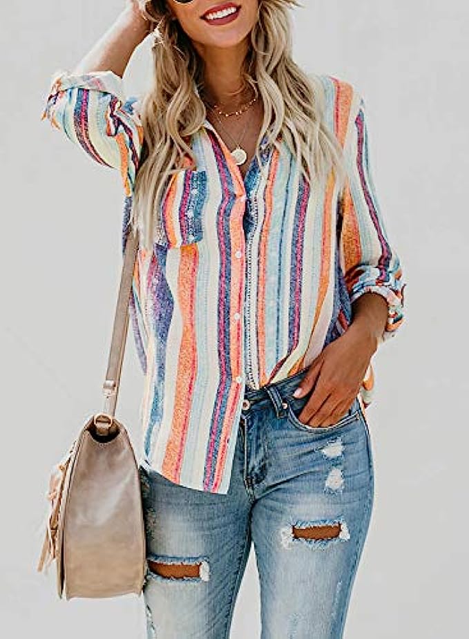 • Features: Button down, V neck, Stripes, Color Block,Cuffed Sleeve