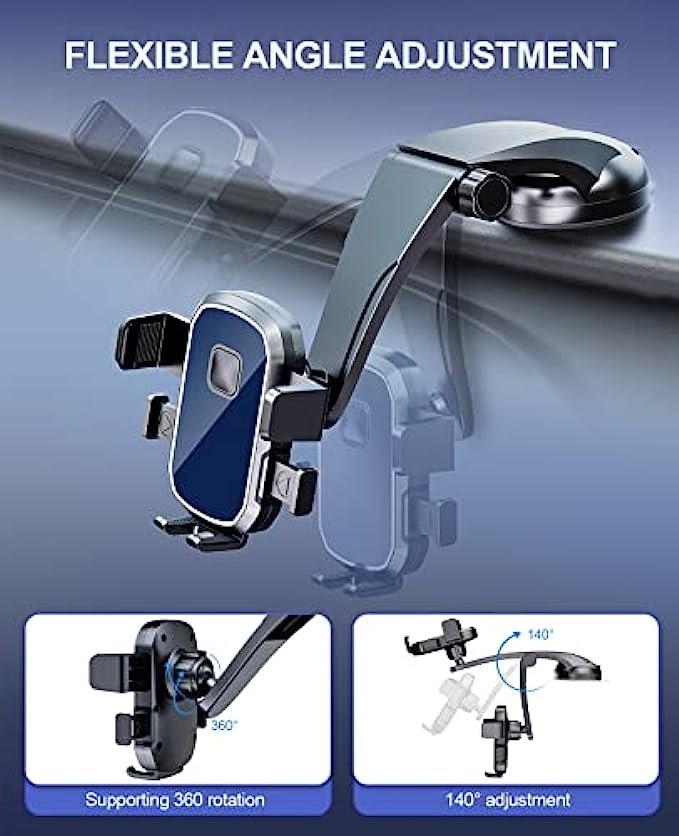 • 【IDEAL VIEWING ANGLE】The car phone mount has a unique long arm that is bent downwards, which does not take up space and never obstructs the line of sight. Highly flexible 360° rotation and 145° up and down adjustment,support mobile phone vertical, horizontal using,so you can get the best view.Enjoy a more relaxed and safer driving experience.