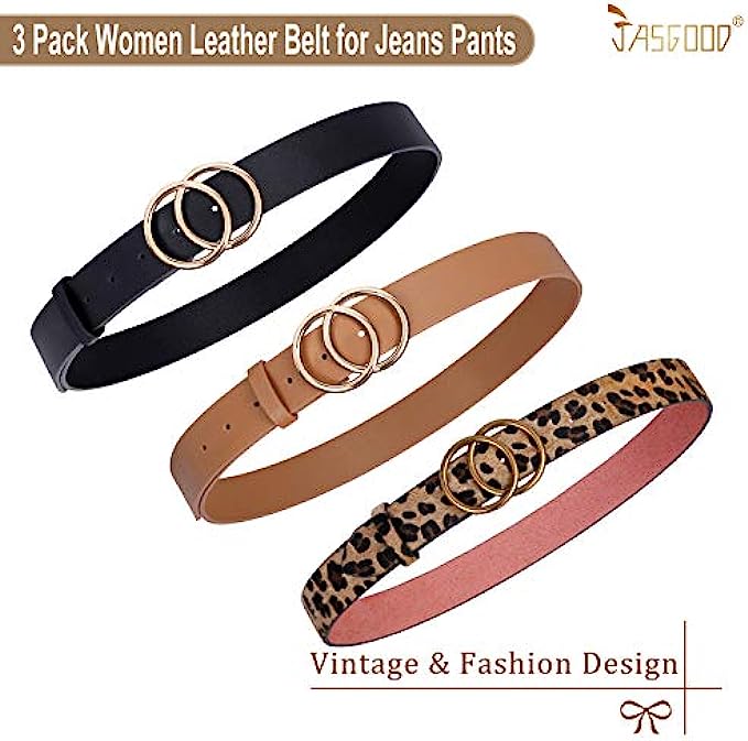 JASGOOD 3 Pack Women Leather Belt for Jeans Pants, Ladies Waist Belts with Double O-Ring Buckle
