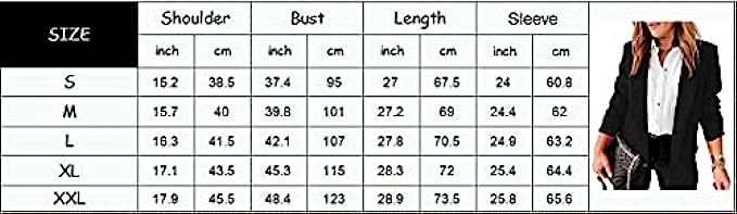 Polyester,Cotton lining Line Dry Material: Soft Fabric. This Jacket Comes With A Full Lining. Soft And Comfortable To Wear. Size: X-Small/US 2-4, Small/US 4-6, Medium/US 8-10, Large/US 12-14, X-Large/US 16-18, XX-Large/US 19-22. Features: Basic Open Front Lapel Collar Blazer Jacket For Women. Casual Loose Fit, Solid Color Office Blazer With Simple Design, Perfectly Suits For Daily Life Or Office Working. Occasion: Suitable for Casual Street Look, Business Outfit, Work Office Style, Leisure Time, Daily Life, Holiday, Vacation and So on. Washing Instruction: Hand Wash Or Machine Wash, Recommend With A Laundry Bag, Do Not Bleach, Hang Or Line Dry.