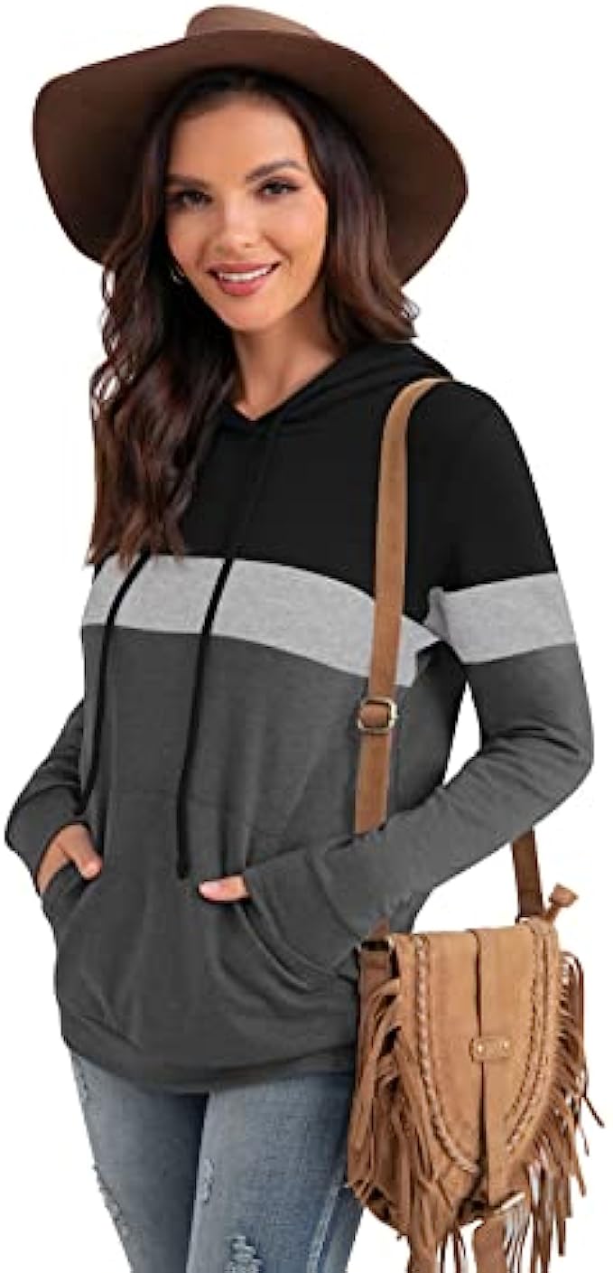 PrinStory Womens Hoodies Pullover Sweatshirts Tunic Top Color Block Long Sleeve Fall Drawstring Tops With Pocket