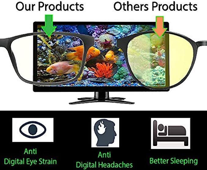 • ✅ PREMIUM ANTI BLUE LIGHT GLASSES REDUCE EYESTRAIN FATIGUE DIGITAL HEADACHE for BETTER SLEEP ★ Highly Recommend For People Works Or Video Gaming Front Of PC Monitor Screen Hours All Day, No Tint HD Clear Lenses (+0.0 No Magnification, Transparent, Non-Polarized) BRING CLEAR VISION. NO YELLOW TINTED, NO COLOR DISTORTION