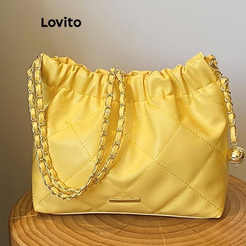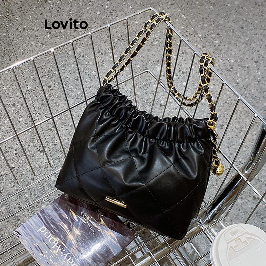 Lovito Vintage Argyle Chain Pom Small Fragrant Style High Capacity Temperament Shoulder Tote Bag for Women LFA27461