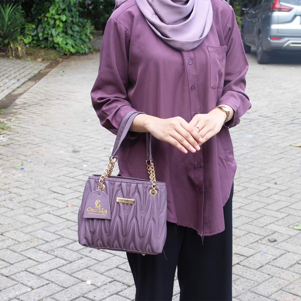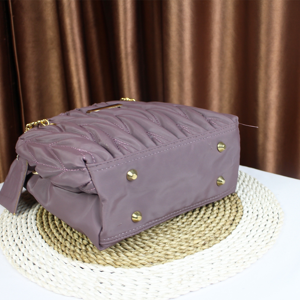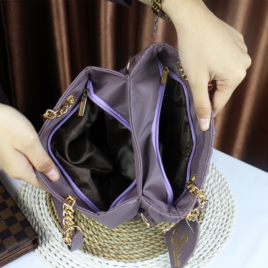 Colour:its more to dull purple Material Quality:acceptable Size is rather small to my expectation but the 2 compartment is spacious enough to load my purse 2 handphones tissue and lipstick