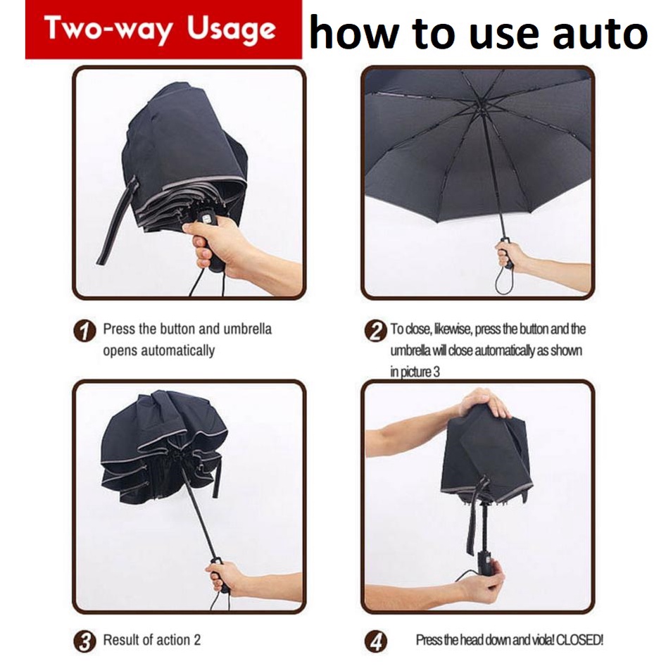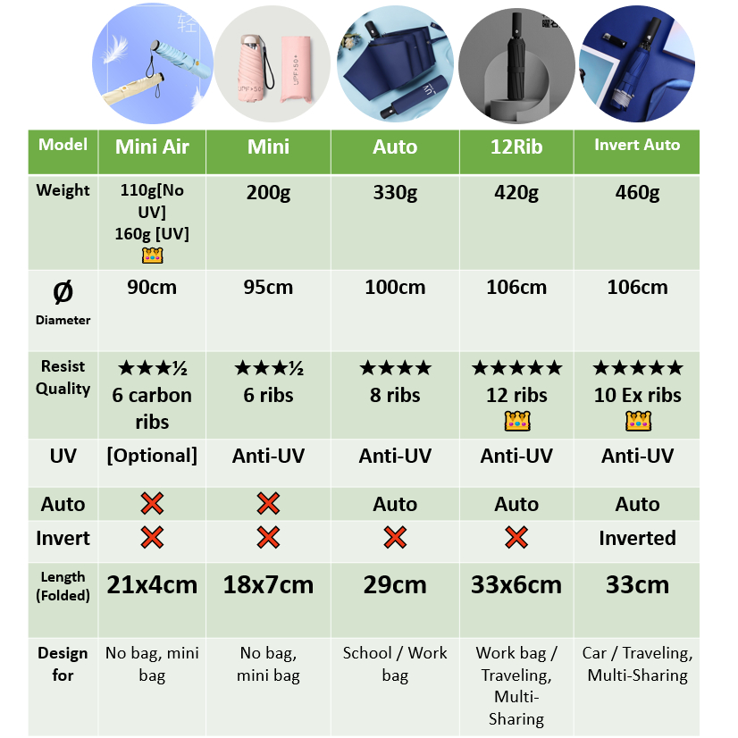 I like automatic. Nice small, colorful orange, thick UV umbrella. Length 28.5cm folded. Umbrella coverage diameter about 95cm. The Inverted umbrella is good for driver. length 34cm folded. Umbrella coverage diameter about 105cm.