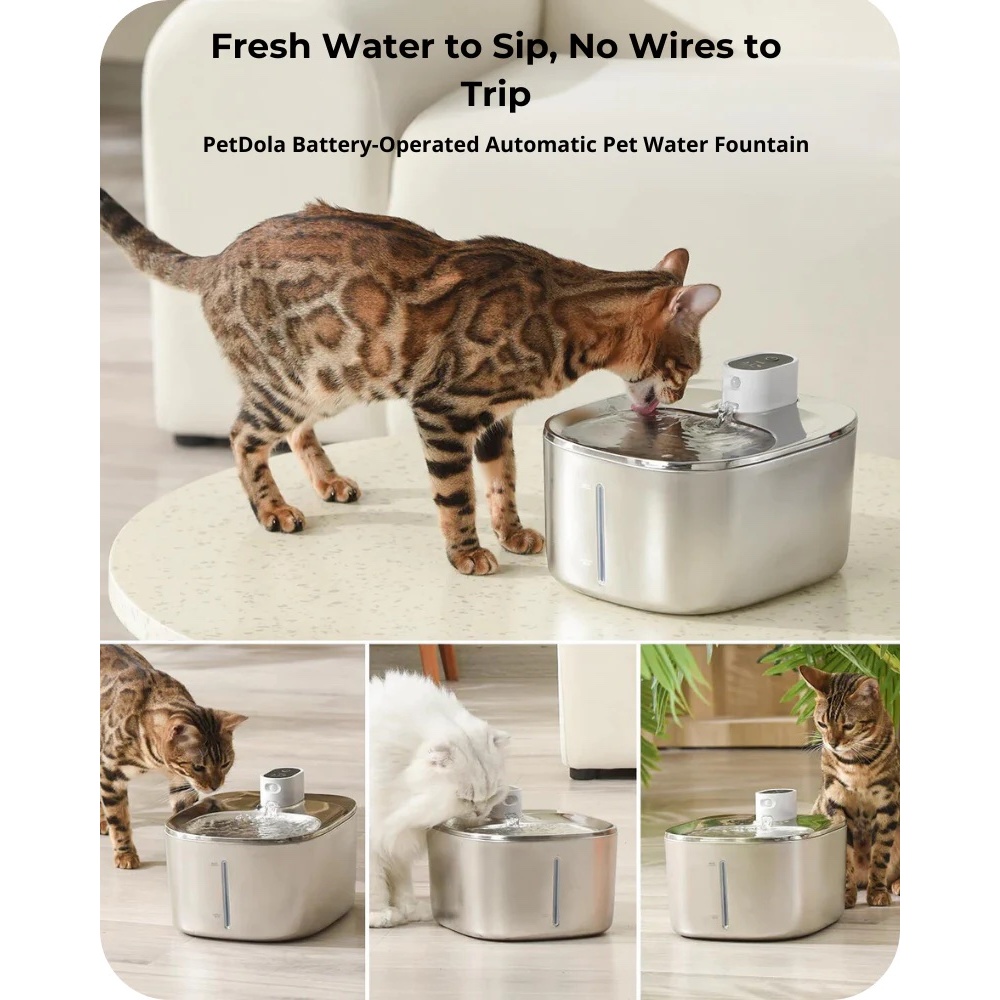 Wireless Cat Stainless Steel Water Fountain 4L Battery Operated with Water Level Window