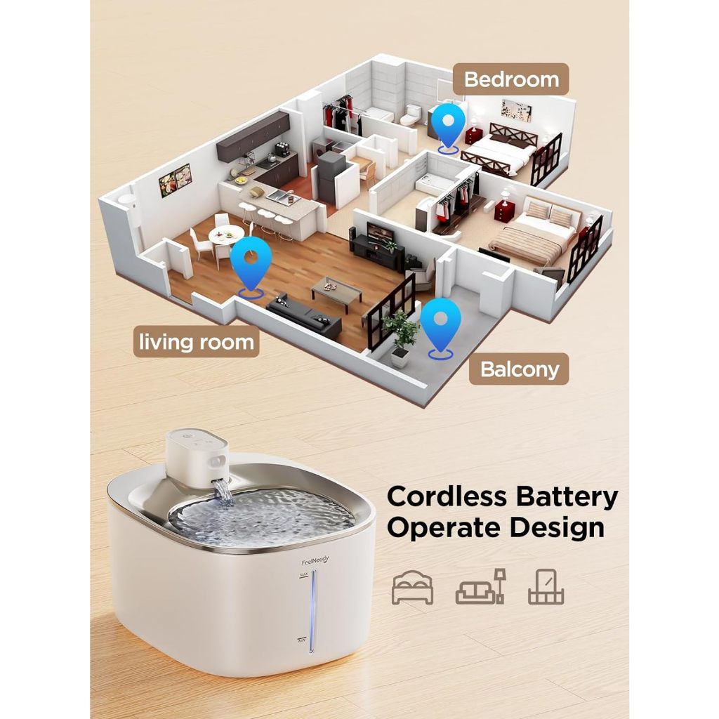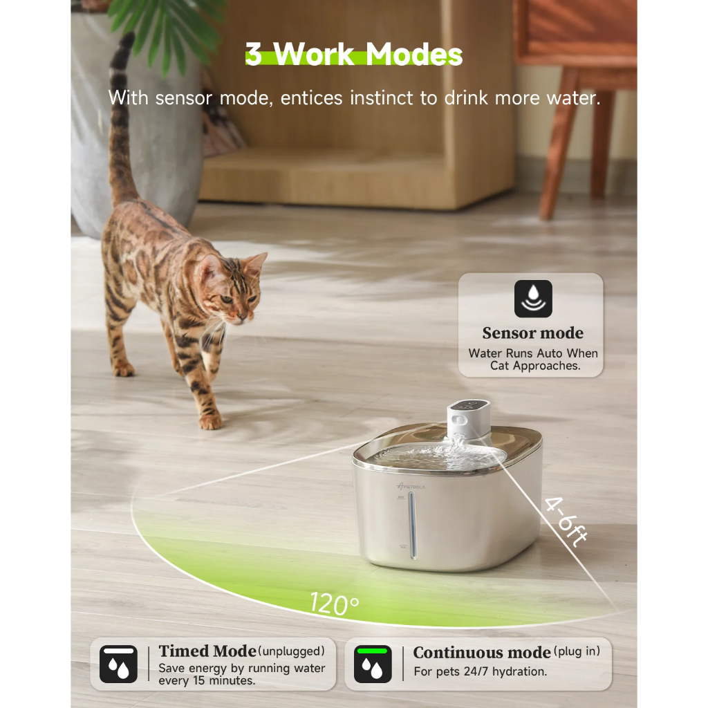 Appearance:stainless steel exterior Quality:good Fully covered water fountain with another layer below tray to filter water. Better than my previous fountain which has a hole for the wire of the pump to connect to the battery base where flies are able to go into the tank. I like the idea that the motion sensor is on top rather than my previous tank which is below because whenever my cat drinks, only his head has movements which sensors at the bottom couldn’t detect. No more worries that water will stop halfway when he’s drinking.