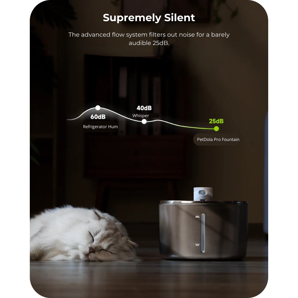Suitability:Yes Appearance:Elegant Quality:Very good My cat love to drink from the fountain. The design is metallic and noise level is keep to a minimum with no disruption at night. Overall quite satisfied with the product.